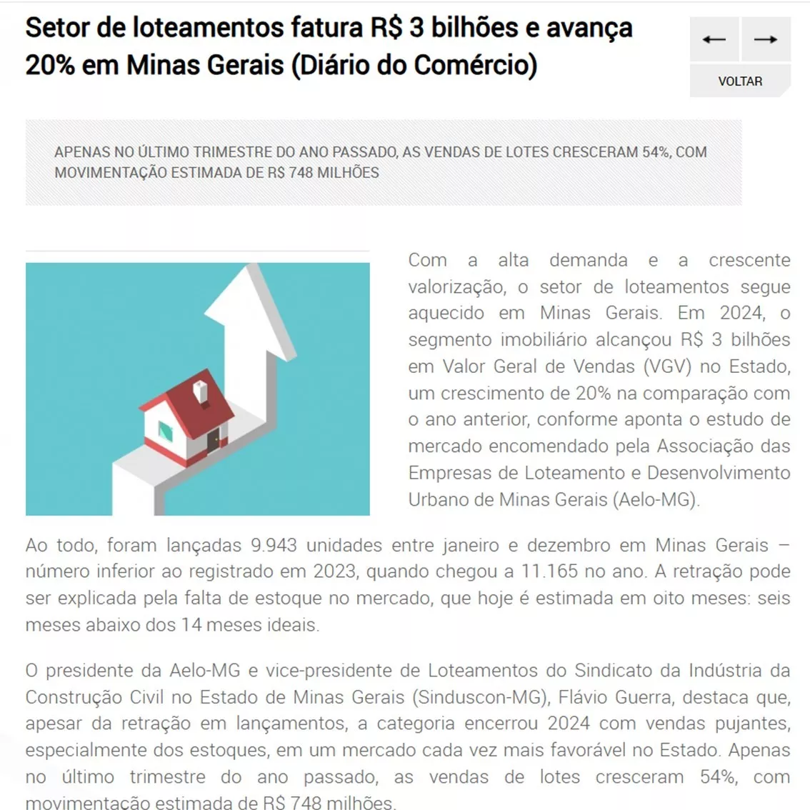 Com a alta demanda e a crescente valorização, o setor de loteamentos segue aquecido em Minas Gerais. Em 2024, o segmento imobiliário alcançou R$ 3 bilhões em Valor Geral de Vendas (VGV) no Estado, um crescimento de 20% na comparação com o ano anterior, conforme aponta o estudo de mercado encomendado pela Associação das Empresas de Loteamento e Desenvolvimento Urbano de Minas Gerais (Aelo-MG).